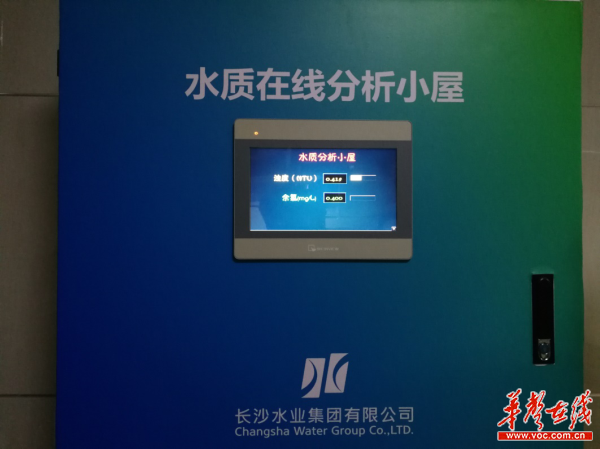 标准化二次供水泵房里配备的水质在线分析小屋能实时显示浊度、余氯等数值。