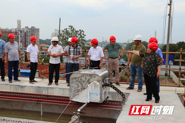 永州市城管执法局党组书记、局长唐慧云(右一)为曲河水厂扩建项目开闸通水试运行。