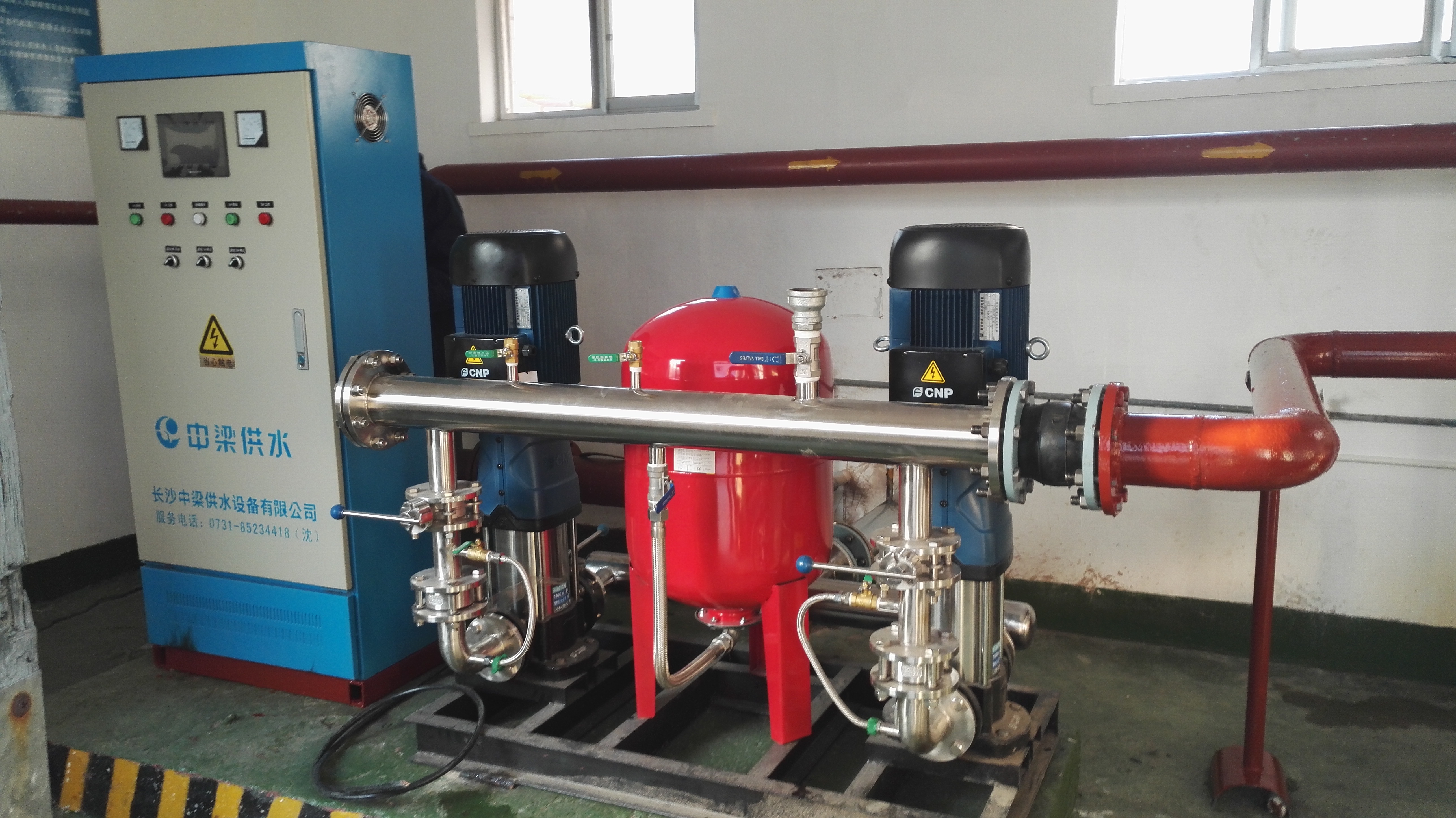 设备还加装气压稳压罐进一步降低水泵对管网启动时的冲击作用,管道和阀门等附件采用硬性连接组成一个整体,比较牢固。