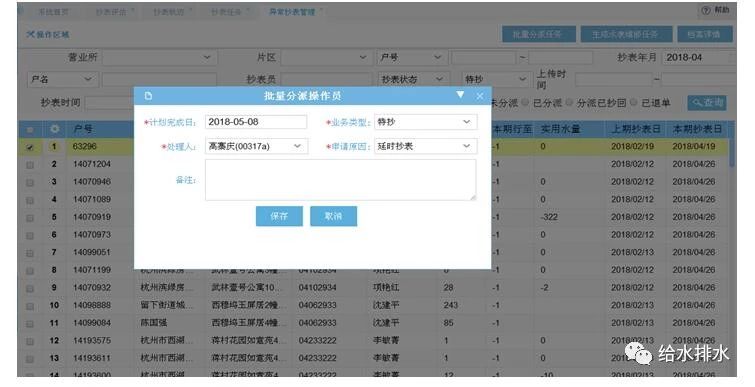 (1)派单:抄表计划、异常复核、特抄(延期抄表)、水费催缴、表务整改等通过营帐系统制定任务,并下派到指定工作人员。工作人员通过工号登入,利用4G无线传输技术,实时领取抄表、复核、整改等任务,任务包含了电子地图信息,可以减少工作人员现场查找时间,提供工作效率。