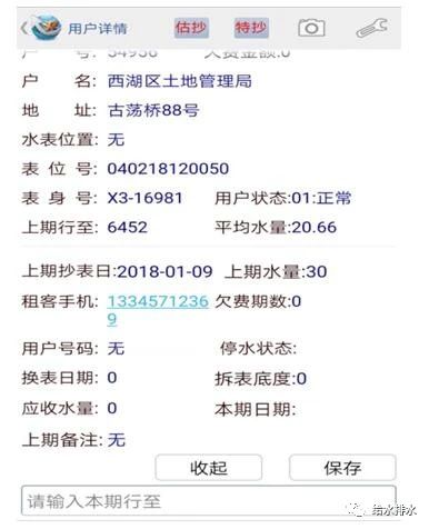 (3)实时查阅:借助无线网络,可实时进行后台数据检索,调阅用户当前基本资料、历史用水信息、欠费及缴费情况、坐标地址、水表地理环境照片等,辅助现场分析办工。