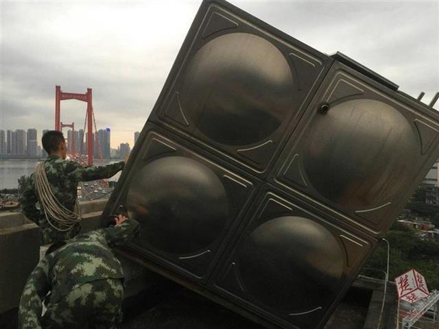 因该小区目前没有入住,一楼大门无法开启,救援人员从二楼的窗户爬进,并徒步至12楼楼顶。“情况特别危险,随时都有可能掉下来。”救援人员江爱华介绍,新一轮暴雨又要降下,必须赶在大雨之前消除隐患。大家用绳子小心翼翼地将水箱捆住,然后奋力往楼顶的中间区域拉,经过3小时的紧张奋战,水箱被复位,为防止再出意外,大家又对水箱箱体进行加固。